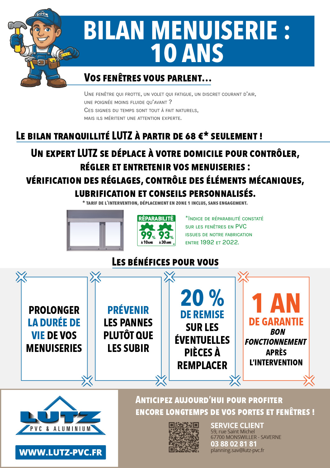 Un expert Lutz se déplace à votre domicile pour contrôler, régler et entretenir vos menuiseries : vérification des réglages, contrôle des éléments mécaniques, lubrification et conseils personnalisés. * tarif de l’intervention, déplacement en zone 1 inclus, sans engagement.